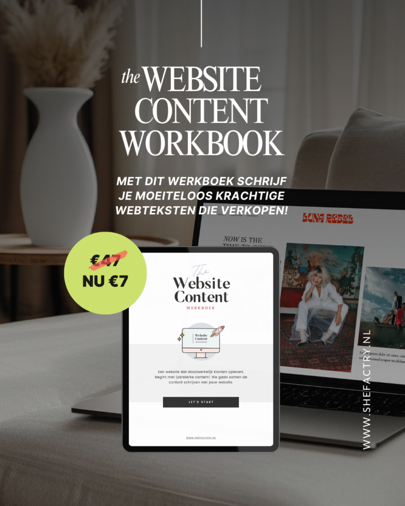 Het Website Content Werkboek begeleidt je stap voor stap door alle benodigde paginatypes. Hierin leg ik precies uit hoe je sterke teksten opbouwt en welke elementen essentieel zijn om daadwerkelijk resultaat te boeken.